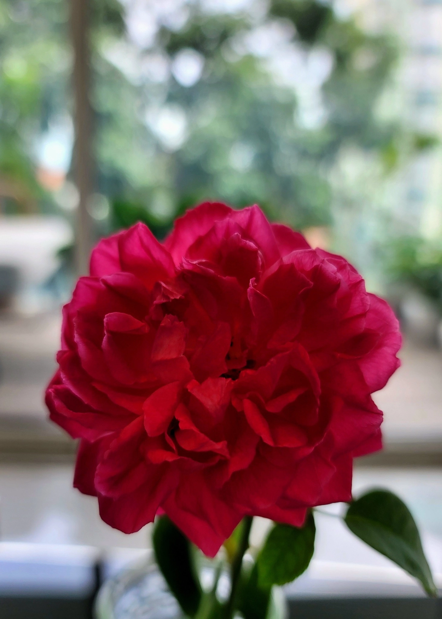 ** Sáng nay hoa hồng trong sân nở một bông rất to.